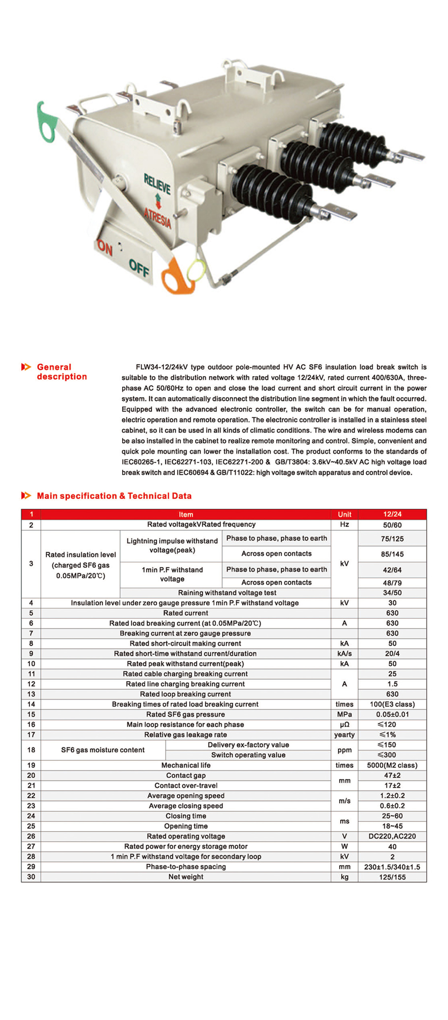 FLW34-12/24KV Outdoor High-voltage SF6 Gas Load Break Switch
